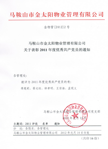 金太陽(yáng)物業(yè)公司表彰2011年度優(yōu)秀黨員通知