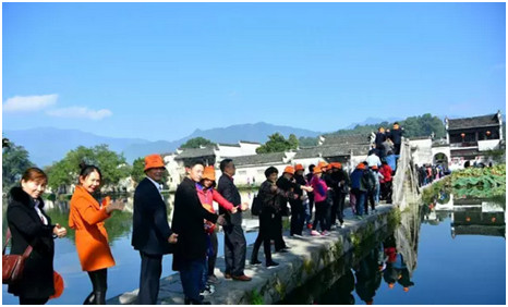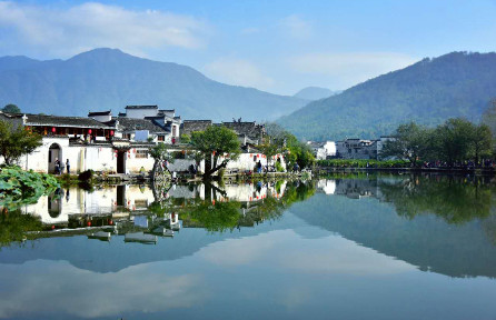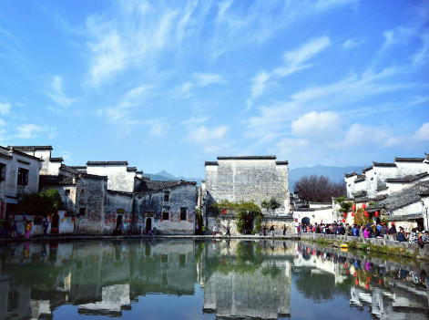 宏村位于安徽省黟縣東北部,地勢較高,常常云蒸霞蔚,時而如潑墨重彩,時而如淡抹寫意,恰似山水長卷,融自然景觀和人文景觀為一體,被譽為“中國畫里的鄉(xiāng)村”。整個村子呈“?!毙徒Y構布局,被譽為當今世界歷史文化遺產的一大奇跡。以村西北一溪鑿圳繞屋 過戶,九曲十彎的水渠,聚村中天然泉水匯合蓄成一口斗月形的池塘,這種科學的村落水系設計,不僅為村民解決了消防用水,而且調節(jié)了氣溫,為居民生產、生活用水提供了方便,創(chuàng)造了一種“浣汲未防溪路遠,家家門前有清泉”的良好環(huán)境。