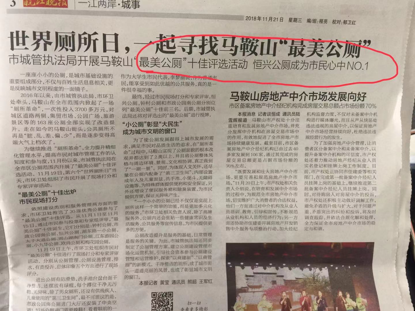 市城管執(zhí)法局開展的馬鞍山“最美公廁”十佳評(píng)選活動(dòng)已落幕,經(jīng)綜合考核打分,我公司管理的公廁項(xiàng)目(恒興公廁)成為市民心中(NO.1),鐘村公廁、雨山湖南門公廁、湖東路一小公廁、太子大道公廁分別位列第二、第四、第五名、第六名這都離不開管理人員的辛勤工作以及我公司各管理處和廣大市民大力支持。