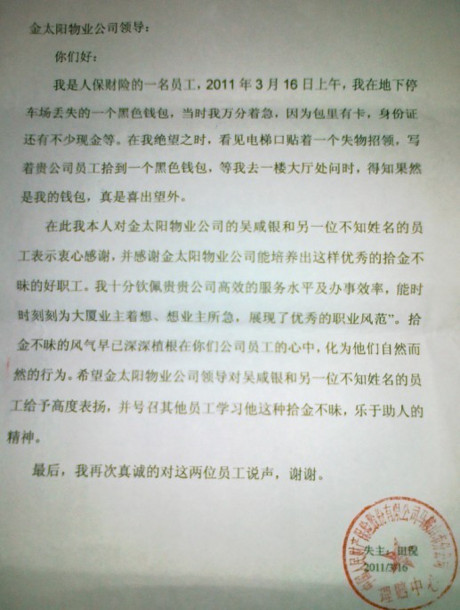 3月16日,我公司功輝大廈管理處保安吳咸銀拾金不昧,及時(shí)歸還,受到業(yè)主好評(píng)。以下是失主寫的表揚(yáng)信: