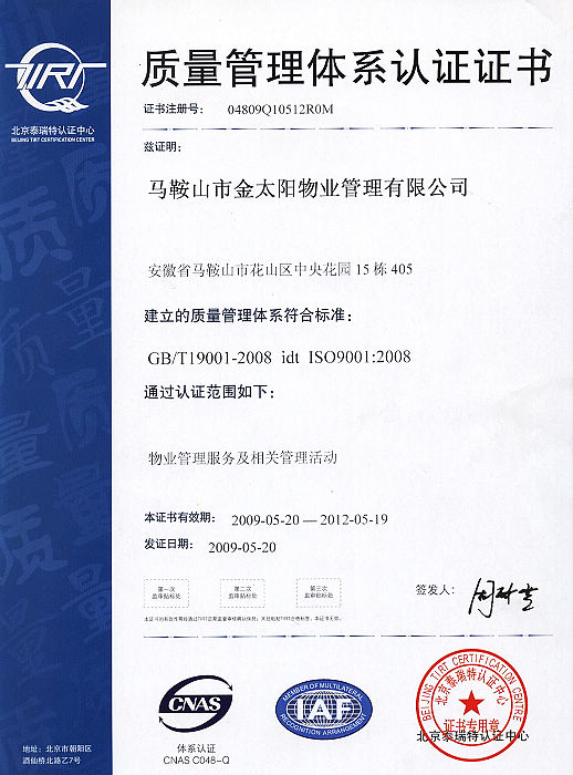 我公司于2009年5月20日正式通過(guò)ISO9001:2008 質(zhì)量管理體系認(rèn)證,我公司將以更加規(guī)范、細(xì)致的管理模式,真誠(chéng)為全市廣大業(yè)主服務(wù)。