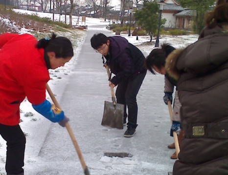 一鋤頭一鋤頭,一鏟一鏟,數(shù)不清的積雪被清掃到了路邊。