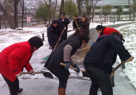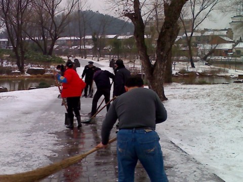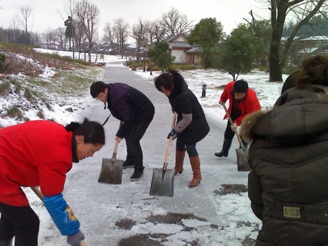 雖然每當(dāng)大雪覆蓋,公司也有嚴(yán)明的經(jīng)律,各管理處必須第一時間將所在管理處的門前和通道清理干凈,各管理處還是在完成好自己職責(zé)的情況下抽調(diào)精兵強(qiáng)將,保證重點、全力以赴。公司在短短的2 個小時時間里調(diào)集23名員工,下午1點及時趕赴采石風(fēng)景區(qū)翠螺灣。在細(xì)雨薄霧中,經(jīng)過4 個小時的緊張戰(zhàn)斗,3000多米的游道終于掀起神秘的面紗,一條清晰的道路展現(xiàn)出來!受到風(fēng)景區(qū)領(lǐng)導(dǎo)的一致好評!